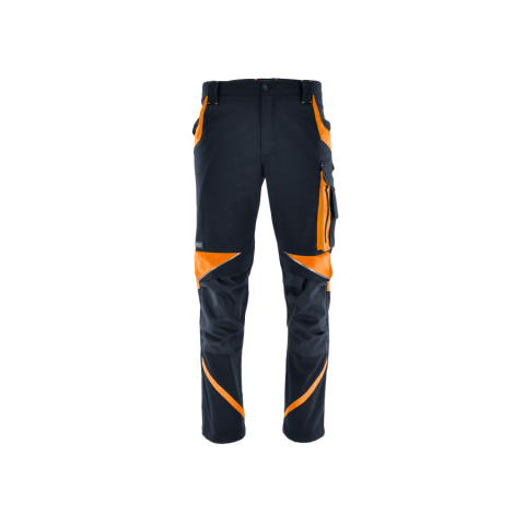 Modern szabású, divatos megjelenésű fekete-neon vagy fekete-narancssárga színösszeállítású Neoflex munkásnadrág. A nadrág térdén kiegészítő fényvisszaverő csík található. Gumírozott derekú munkásnadrág, oldalán elasztikus pántokkal, öv számára kialakít