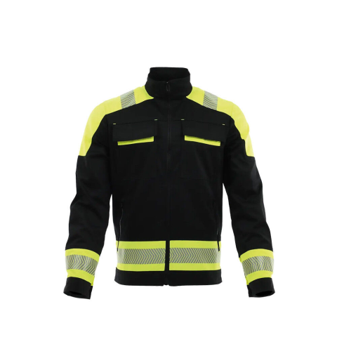 Karcsúsított szabás, rugalmas, funkcionális kialakítás. A vállakon, a mandzsettákon és a derék részen jólláthatósági modullal, és 5 cm széles szegmentált fényvisszaverő szalagokkal.álló gallércipzáras záródáskét cipzáras oldalzsebzsebfedős, tépőzáras mell