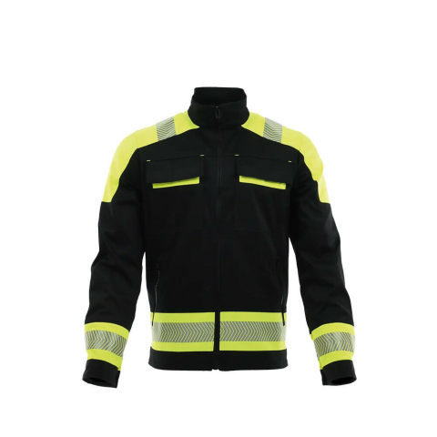 Karcsúsított szabás, rugalmas, funkcionális kialakítás. A vállakon, a mandzsettákon és a derék részen jólláthatósági modullal, és 5 cm széles szegmentált fényvisszaverő szalagokkal.álló gallércipzáras záródáskét cipzáras oldalzsebzsebfedős, tépőzáras mell