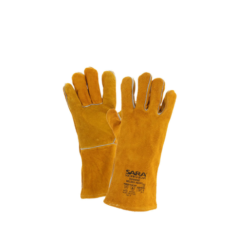 Hasított marhabőr hegesztő kesztyű. Tartós, lángálló kevlár varrások 100 C fokig kontakt hő elleni védelem. 350 C fokig (konvekciós hő)forró levegő és gázok elleni védelem. A kesztyű mandzsettája védi az alkar középső részét.