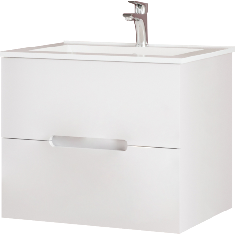 Fürdőszobabútor 60 cm 2 csillapított záródású fiókkal, kerámia mosdóval, vákuumpréselt front, magasfényű fehér.