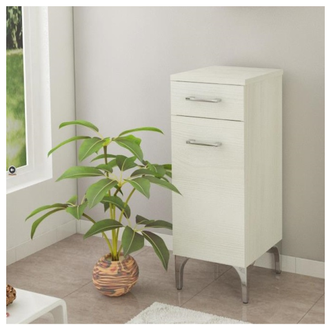 Jobbos alacsony szekrény fehér színben, 31,5x88x33,5 cm-es méretben, 1 ajtós és 1 fiókos kivitelben.