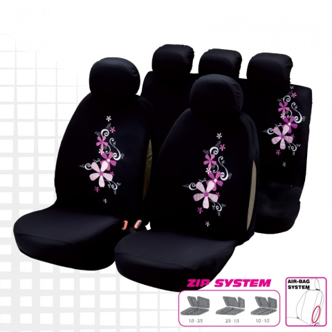 MyBoquet csajos üléshuzat garnitúra, élénk virágos mintával My Bouqet autó üléshuzat szett, rózsaszín virágos mintával. Rugalmas anyagból készült, a szövet alatt vékony szivacs betéttel. Az ülésvédő huzat 9 részes garnitúra tartalmazza mind az első és