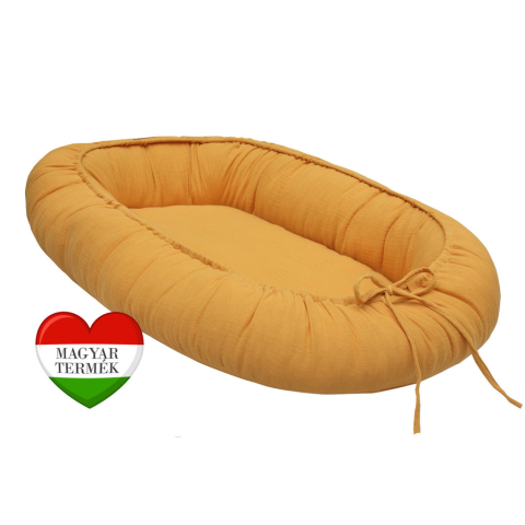 Scamp muszlin babafészek, mustársárga színben.Méretek:Teljes mérete: 50cm×80cmFekvőfelülete: 28×60 cmMagassága:12cm Anyaga:Huzat: 100% pamut un. muszlinPerem töltet: antiallergén, 100% szilikonizált poliésztergolyóA termék a fekvőbetét eltávolítása után 3