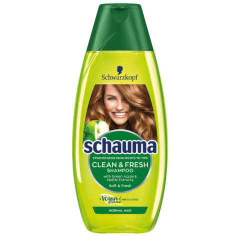 Schauma Clean & Fresh sampon zöld almával és csalánnal regenerálja és ápolja a száraz és sérült hajat. Vegán formulája tisztítja és felfrissíti a fejbőrt, miközben belülről gyengéden regenerálja a hajszálakat, intenzív puhaságot és sima felszínt kölcsönöz a hajnak.