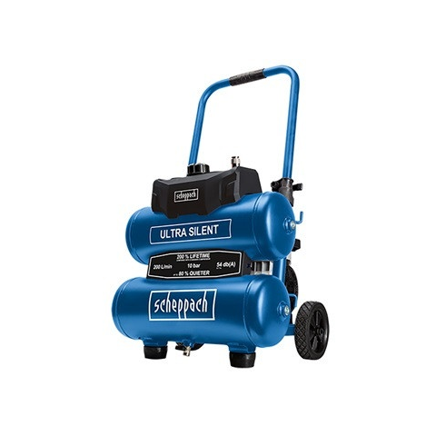 A Scheppach HC 20 Si Twin kompresszort három dolog jellemez: csendes, nagy teljesítményű és kompakt.