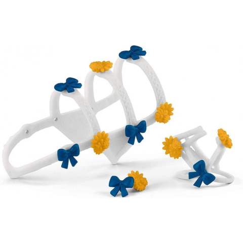 A lovas kiegészítő készlet tartalmaz: fehér kantár, fehér hám, 6db sárga, virág alakú dísz és 6db kék, masni alakú dísz. A díszek a hámra és a kantárra is felhelyezhetők.