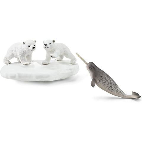 A Schleich jegesmedvebocsok jól szórakoznak a jégtáblán: vadul ugrálnak és birkóznak! A játék hevében az egyik jegesmedve túl közel merészkedett a jégtábla széléhez és a vízbe csúszott. Szerencsére egy barátságos narvál a közelben úszkált és gyorsan a kis