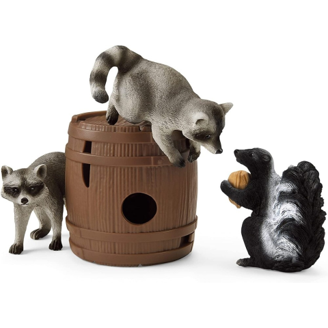 A Schleich legújabb játékában két mosómedve és egy mókus játszik egy dióval a hordó körül. A mosómedve és a mókus is meg tudja tartani a mancsában a diót, valamint a hordó oldalán lévő lyukon keresztül is be lehet helyezni a termést a hordóba.