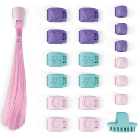 A divat lovas sörény kiegészítő készlet tartalmaz: csatokat, gyöngyöket, kefét és egy sörényt. A kiegészítők a fésülhető Schleich Sofia's Beauties lovakhoz használhatók.