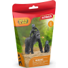 Milyen imádnivaló gorilla család! Az anya vigyáz két kicsinyére. Az egyik fáradtnak tűnik, álmosan ül a földön, talán szundikálni készül? A másik gorilla kölyök éber, és az anyja hátára szeretne felmászni. A kismajom karjaival szorosan kapaszkodik any