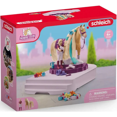 A Schleich Sofia's Beauties lóápoló és szépítő állomást minden ló és lovas imádni fogja. A ló fésülhető sörénye és farka a készletben lévő kiegészítőkkel (csatok, gyöngyök, díszek) szabadon díszíthetők, aminek köszönhetően teljesen egyedi megjelenés a