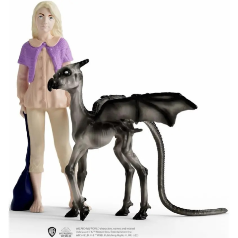 Schleich Harry Potter - Luna Lovegood és thesztrál kölyök: Luna a Hollóháti-ház tanulója, aki furcsa ötleteivel nem mindig nyeri el társai szimpátiáját. Mellette áll egy varázslatos lény, egy béi thesztrál, ami egy nagy méretű, lóra emlékeztető, mágikus l