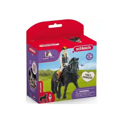 A Schleich Horse Club újabb készlettel bővül: Tori és Princess nevű fríz lova érkezik a gyerekekhez. Amikor Tori lovagolni indul, először felnyergeli hűséges négylábú barátját, és ráteszi a kantárt. Végül a sisakot is felveszi. De nem felejtett el val