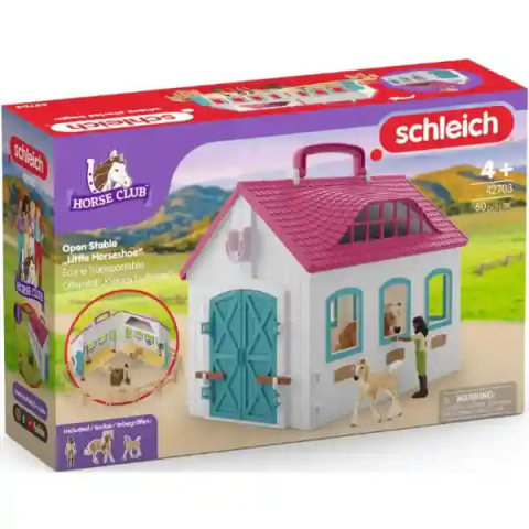 Schleich 42703 Hordozható lovarda: új istállóval bővül a farm, ahol a lovak szabadon lehetnek a friss levegőn. Sarah éppen a Haflinger kancát és csikóját eteti, majd óvatosan megpróbálja hozzászoktatni a kiscsikót a vezetőszárhoz. A tágas karám tökéle
