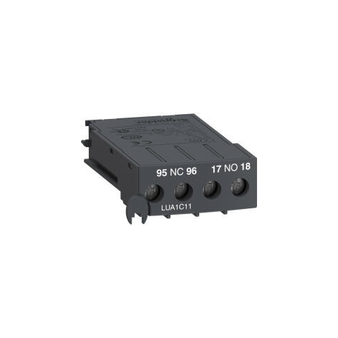 LUA1C11 Érintkezőblokk Schneider TeSys U segédérintkező érintkezőblokk TeSys U motorindító vezérlőkhöz. 1 db NO érintkezőt biztosít a nyitott/zárt állapothoz (OF érintkező) és 1 db NC érintkezőt a kioldási állapothoz (SD érintkező), ami legfeljebb 5 A-es,