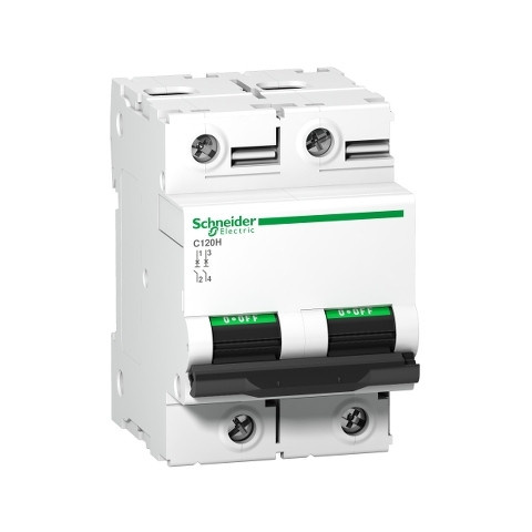 Kismegszakító 2B 100A 15kA C120H ACTI9 A9N18414 Schneider \nACTI9 C120H kismegszakító, 2p, B, 100A. termékcsalád: C120, Acti 9 - termék neve: C120 - termék vagy komponens típusa: kismegszakító - készülék rövid megnevezése: C120H - készülékalkalmazás: el