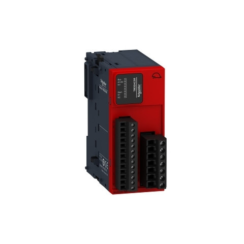Bővítő m. TM3 SAFETY CAT.3 TM3SAC5R Schneider Ez a TM3 biztonsági bővítő modul figyeli a vészleállító nyomógombokat és a végálláskapcsolókat, hogy megfeleljenek a PLd/3. kategória követelményeinek. Megfelel az EN/ISO 13849-1 szerinti PL d/3. kategória és