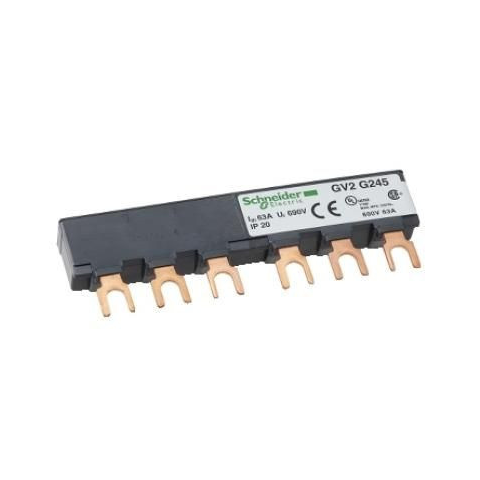 GV2-G245 fésűs sín 2db 2x45mm leágazás Schneider TeSys GV gyűjtősín készlet, 3 fázis, 63 A/690 V, motorindítók csoportjainak párhuzamos huzalozásához, amelyek GV2 motorvédő megszakítóból vagy LS1D32 olvadóbiztosító aljzatokból állnak. Csavaros szorító