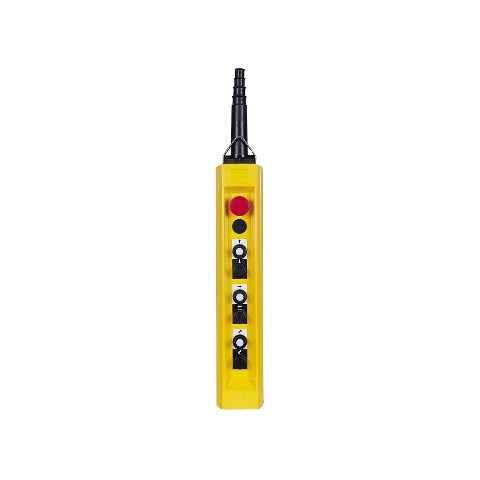 6 nyomógomb, mechanikus retesz, 3 pólus, +vészgomb, 3kW XACB6933 Schneider \nFüggőkapcsoló XAC-B, 6 nyomógomb 1 vészleállító. termékcsalád: Harmony XAC - termék vagy komponens típusa: felfüggesztett vezérlő állomás. Előnyök : Mechanikus anyagmozgatáshoz