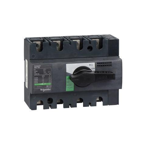 Interpact INS100 4P fekete kapcsolókarral 28909 Schneider Kapcsolós leválasztó Interpact INS100, 4-pólusú, 100A. termékcsalád: Compact - hálózat típusa: AC, DC - hálózati frekvencia: 50/60 Hz - icm névleges rövidzárlat bekapcsolási teljesítmény: 154