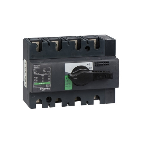 Interpact INS125 4P fekete kapcsolókarral 28911 Schneider Szakaszolókapcsoló Interpact INS125, 4-pólusú, 125A. termékcsalád: Compact - hálózat típusa: AC, DC - hálózati frekvencia: 50/60 Hz - icm névleges rövidzárlat bekapcsolási teljesítmény: 154 k