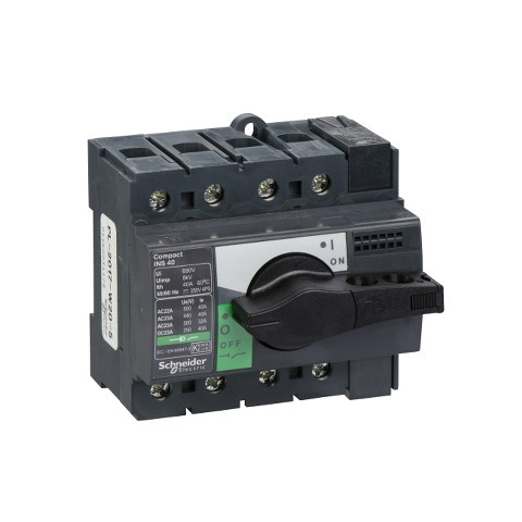 Interpact INS40 4P fekete kapcsolókarral 28901 Schneider Ez a Compact INS40 egy 4-pólusú nem automatikus szakaszolókapcsoló fekete forgatókaros hajtással. Alkalmas az IEC 60947-1 és az IEC60947-3 szabvány szerint meghatározott pozitív érintkezőkijelz