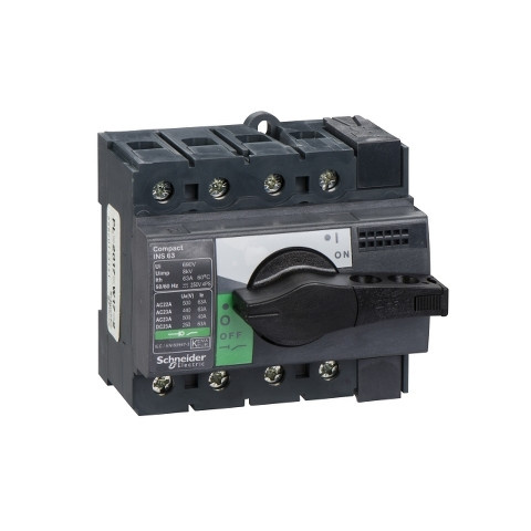 Interpact INS63 4P fekete kapcsolókarral 28903 Schneider Szakaszolókapcsoló Interpact INS63, 4-pólusú, 63A. termékcsalád: Compact - hálózat típusa: AC, DC - hálózati frekvencia: 50/60 Hz - icm névleges rövidzárlat bekapcsolási teljesítmény: 15 kA 50