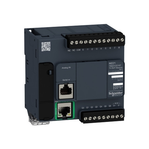 TM221CE16T Modicon M221 gépvezérlő PLC, 16 I/O, tranzisztor (source) kimenet, RS232/RS485, Ethernet Modbus TCP/IP, 24 VDC Schneider Ez a TM221 vezérlő a Modicon M221 vezérlőcsalád része. 16 logikai be- és kimenettel rendelkezik, és 24 VDC tápellátással mű