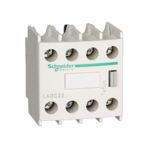 Segédérintkező blokk, homloklapi, 2Z+2NY, csavaros csatlakozás, átlapolt LADC22 Schneider \nSegéd érintkezőblokk TeSys, 2 NO+2 NC, csavarkapcsos sorkapcsok. termékcsalád: TeSys D, TeSys D mágneskapcsoló, TeSys F, TeSys - termék vagy komponens típusa: se