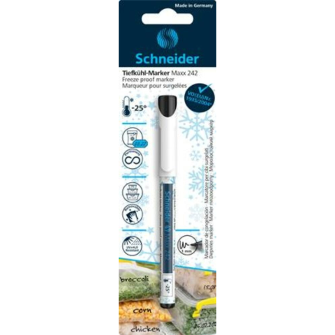 Fagyálló marker, SCHNEIDER Maxx 242, fekete (TSC242FK) Marker fagyasztóba kerülő zacskók, matricák, fóliák, dobozok, üvegek címkézésére. - a tinta -25° C-ig fagyálló - a tinta színe fekete - vonalvastagság: 1 mm - kopás-, víz- és fényálló - tartósan
