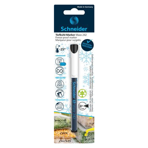 Fagyálló marker, SCHNEIDER Maxx 242, fekete Marker fagyasztóba kerülő zacskók, matricák, fóliák, dobozok, üvegek címkézésére. - a tinta -25° C-ig fagyálló - a tinta színe fekete - vonalvastagság: 1 mm - kopás-, víz- és fényálló - tartósan megmarad a