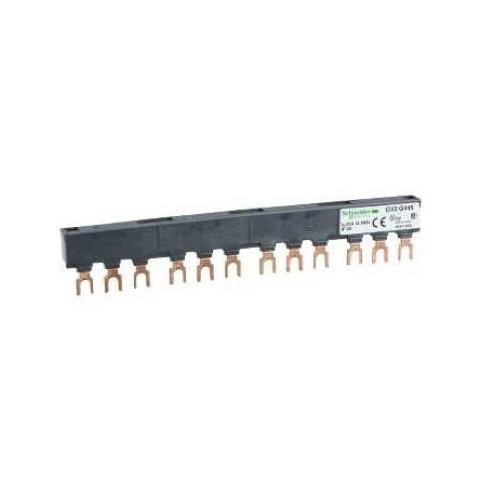 Fésűs sín villás,3P, 12 osztás GV2-G445 Schneider TeSys GV gyűjtősín készlet, 3 fázis, 63 A/690 V, motorindítók csoportjainak párhuzamos huzalozásához, amelyek GV2 motorvédő megszakítókból vagy LS1D32 olvadóbiztosító aljzatokból állnak. Csavaros szo