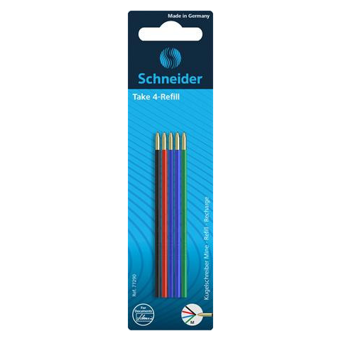 Golyóstollbetét, 0,5 mm, SCHNEIDER Take 4, 4 különböző szín Golyóstollbetét, 4 különböző színben Take 4 modellekhez -vízálló tinta (ISO 12757-2 tanúsítványnak megfelelően) -M-es vonalvastagság -„ViscoGlide” tinta: könnyedebb, gördülékenyebb írást bizt