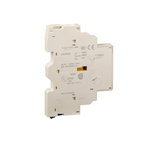 GVAN20 Segédérintkező blokk, oldalsó, Z+Z Schneider TeSys GV segédérintkező-blokk motorvédő megszakítókhoz GV2 és GV3. 2NO pillanatkioldású segédérintkezők. Legfeljebb 6 A/690 V-os váltakozó áram és 6 A/240 V egyenáram működtetésére méretezve. A megsz