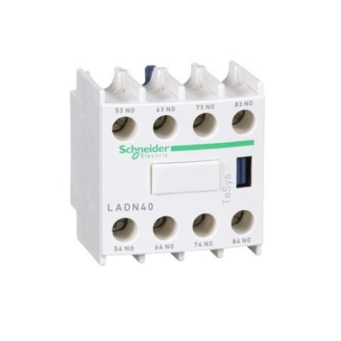 LAD-N40 Segédérintkező blokk, homloklapi, 4Z, csavaros csatlakozás Schneider TeSys D pillanatkioldású segédérintkező-blokk LC1D, LC1F mágneskapcsolókhoz és LC1F vezérlőrelékhez (CAD). 4NO érintkezőket biztosít, amelyek névleges teljesítménye 10 A/690