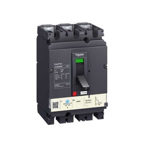 Az EasyPact CVS250B egy 3-pólusú 3d-s fix áramköri megszakító, amely magas teljesítményű és költséghatékony funkciókkal rendelkezik. Kis- és közepes méretű épületvédelmi alkalmazások esetén ideális választás. Az Icu megszakítóképessége 25 kA rms 415 V~ 50/60 Hz esetén. A működési feszültség 440 V~ 50/60 Hz. Ez a termék 250A névleges termikus-mágneses kioldóegységet (TMD) tartalmaz. A TMD kioldóegység állítható termikus túlterhelés elleni védelmet
