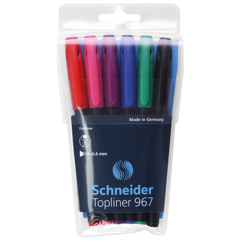 Rostirón, tűfilc készlet, 0,4mm, Schneider TopLiner 967, 6 klf. szín kiváló választás mindennapi használatra. Megbízható, tartós és praktikus megoldás! Írásra, rajzolásra alkalmas általános használatú, vékony írásvastagságú tűfilc, vízbázisú festékkel