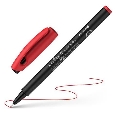 Tűfilc, 0,4 mm, SCHNEIDER Topliner 967, piros - vékony és pontos írás - a rozsdamentes hegy folyamatos írásképet eredményez - vízbázisú tintával töltve - fekete, műanyag tolltest - a tollvég színe megegyezik a tinta színével - vonalvastagság: 0,4 mm -
