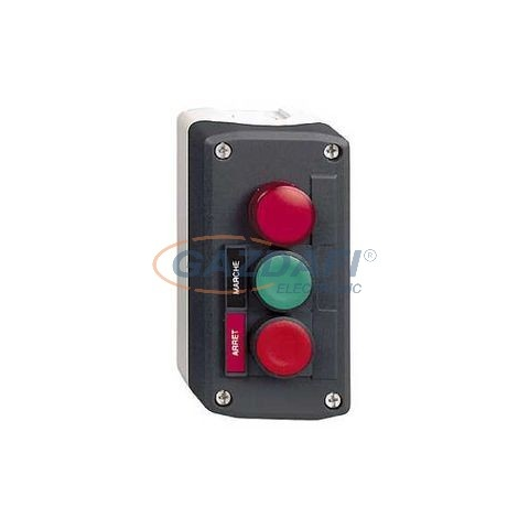 Harmony XALD tokozott nyomógomb, 1 zöld - 1 piros nyomógomb - 1 piros 24V LED lámpa, 1NO+1NC, Marche Arrét feliratok