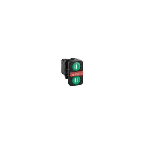 Harmony komplett műanyag kettősfejű nyomógomb, Ø22, visszatérő, 2NO+1NC, 2 zöld I/II + 1 piros kiálló STOP gomb
