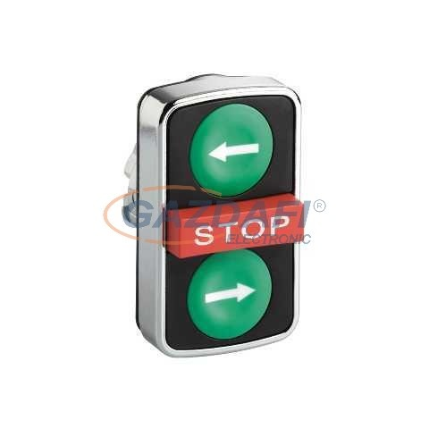 Harmony fém kettősfejű nyomógomb fej, Ø22, visszatérő, 1-1 zöld jobb/bal nyíl nyomógomb, piros kiemelkedő STOP gomb