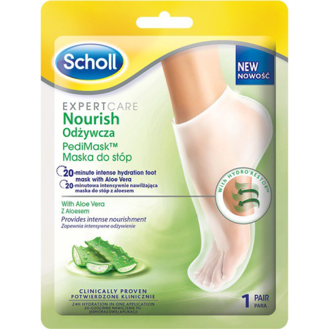 Lábmaszk - hidratáló és bőrsimító A SCHOLL PediMask Aloe Vera lábmaszk gondoskodik a láb bőréről. Ideális megkeményedett bőrön történő használatra. Ez a mélyen tápláló lábmaszk intenzíven hidratálja a bőrödet. A zokni alakú maszk könn