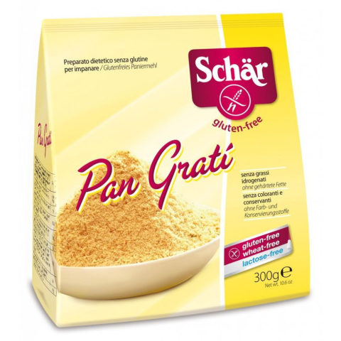 Schär Pan Grati zsemlemorzsa 300 g Halak, húsok, zöldségek panírozásához, gluténmentes kenyérmorzsa. A Pan Grati zsemlemorzsa tej hozzáadása nélkül készült