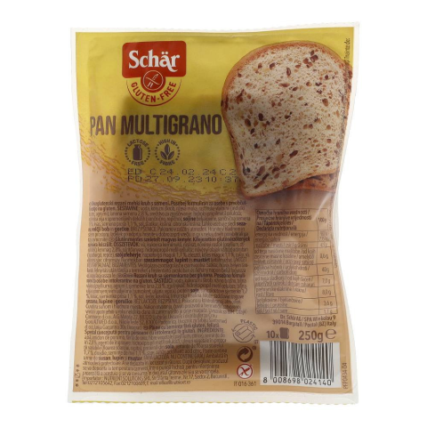 Schär gluténmentes kenyér pan multigrano 250 g Gluténmentes szeletelt magvas kenyér. Kifejezetten gluténérzékenyek számára készült. Összetevők: víz , kukoricakeményítő , rizsliszt , növényi rostok (psyllium, citrusfélék) , lenmag 2,8% , sűrítő anyag: