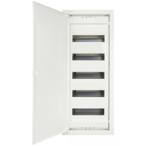 Gipszkarton falba süllyeszthető lakáselosztó 70 modulos Nettó szélesség 346,00mm Nettó magasság 842,00mm Nettó mélység 96,00mm Ajtó anyaga acéllemez Készüléksorok száma 5 Készülékegység soronként 12 Védettségi fokozat IP40 Érintésv