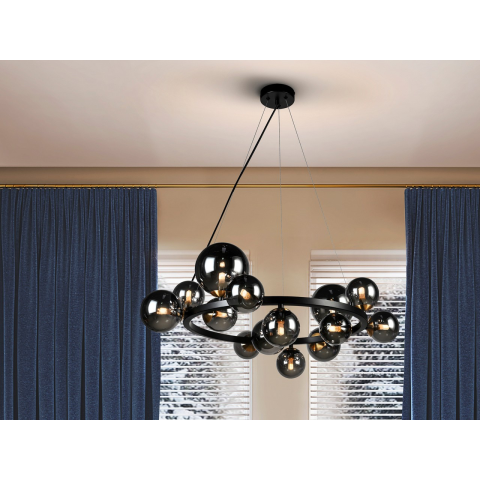 Lámpa 14 lámpából, fémből, matt fekete felülettel és polírozott sárgarézből. Gömb alakú üvegbúra csillogó füstölt szürke tónusban. Állítható hosszúság...