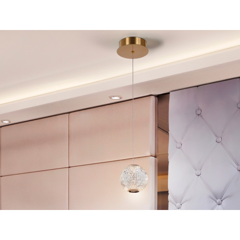 Lámpa 1 LED-es lámpából, fém, arany színben. Gömb alakú, átlátszó optikai akril, hasonlatos faragott kristály. 6W LED. 3200 ezer. 272 lm...
