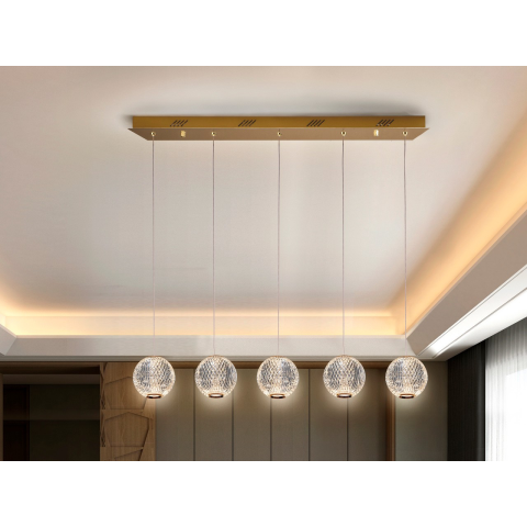 Lámpa 5 LED-es lámpából, arany színű fém kivitelben. Gömb alakú, optikai akril, hasonlatos faragott kristály. 26W LED. 3200K, 1264lm...