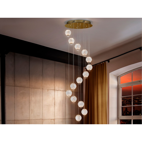 Kerek lámpa 14 LED-es lámpából, arany színű fém kivitelben. Gömb alakú árnyalatokoptikai akril, fazettás kivitel. 69W LED. 3200K, 3,745 lm...